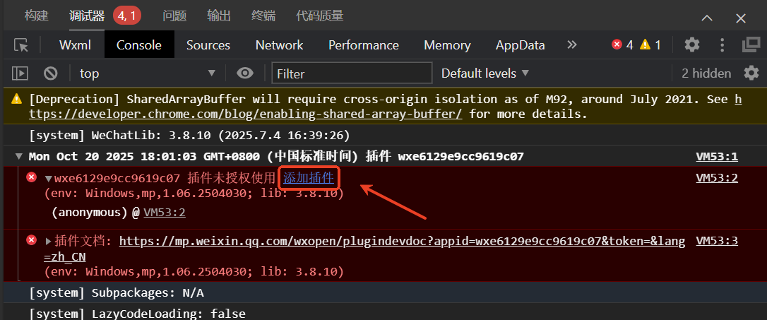 在微信开发者工具中添加插件adcore,如果已添加过则忽略