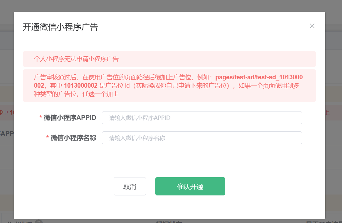 输入微信小程序APPID、微信小程序名称,最后点击“确认开通”。